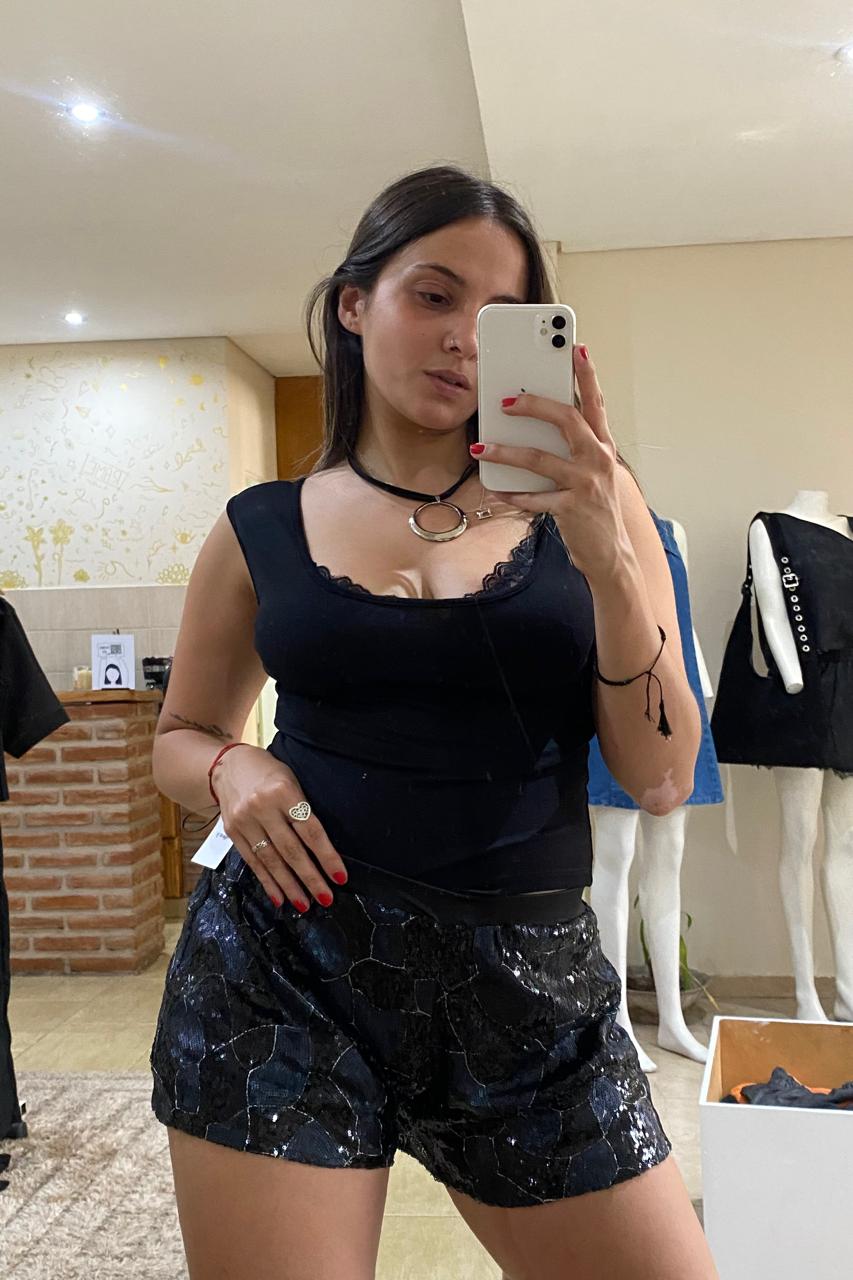 Noche Total: Combiná el short con una musculosa básica negra de escote profundo y accesorios metálicos (como en la foto) para un look de fiesta imbatible.