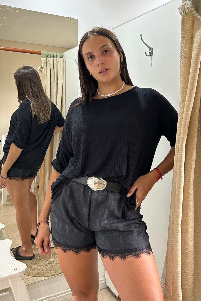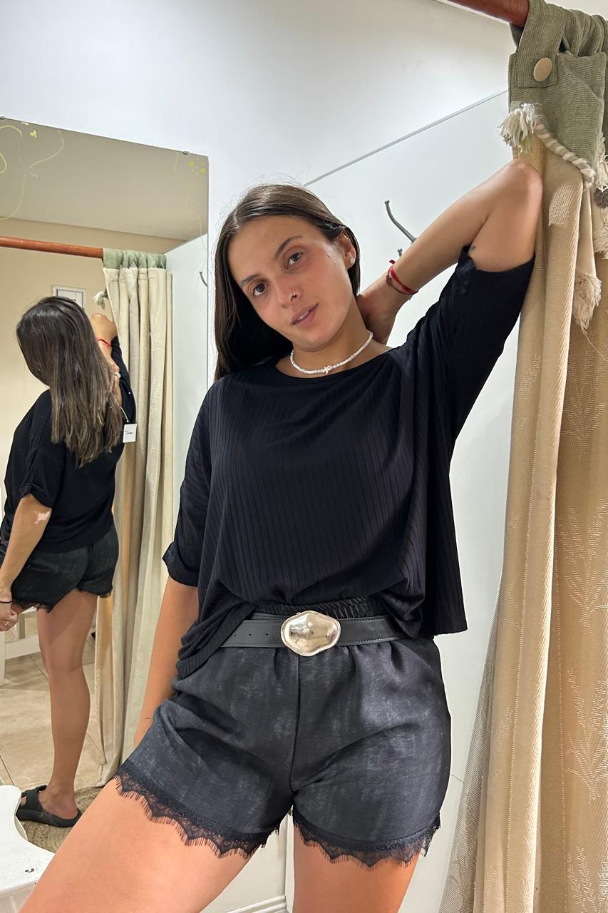 Total Look Urbano: Llevála con nuestro Short Batik con Encaje y un cinturón llamativo para un outfit de alto impacto.