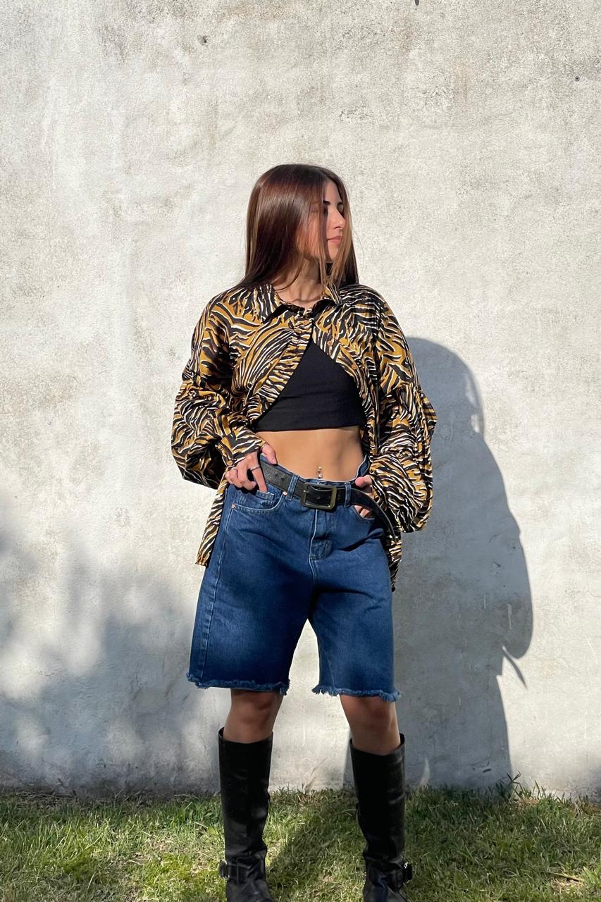 Look Urbano de Impacto: Combiná la camisa abierta con un top básico negro y nuestra Bermuda Denim azul para un outfit moderno y equilibrado.