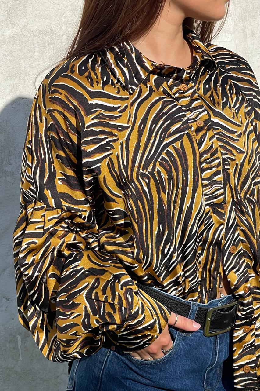 Audacia y fluidez en cada detalle. Nuestra camisa Safari Night es la pieza clave para quienes buscan un look con fuerza y elegancia. Destaca por su estampa de cebra en tonos tierra y negro, combinando una silueta clásica con un diseño contemporáneo y audaz.