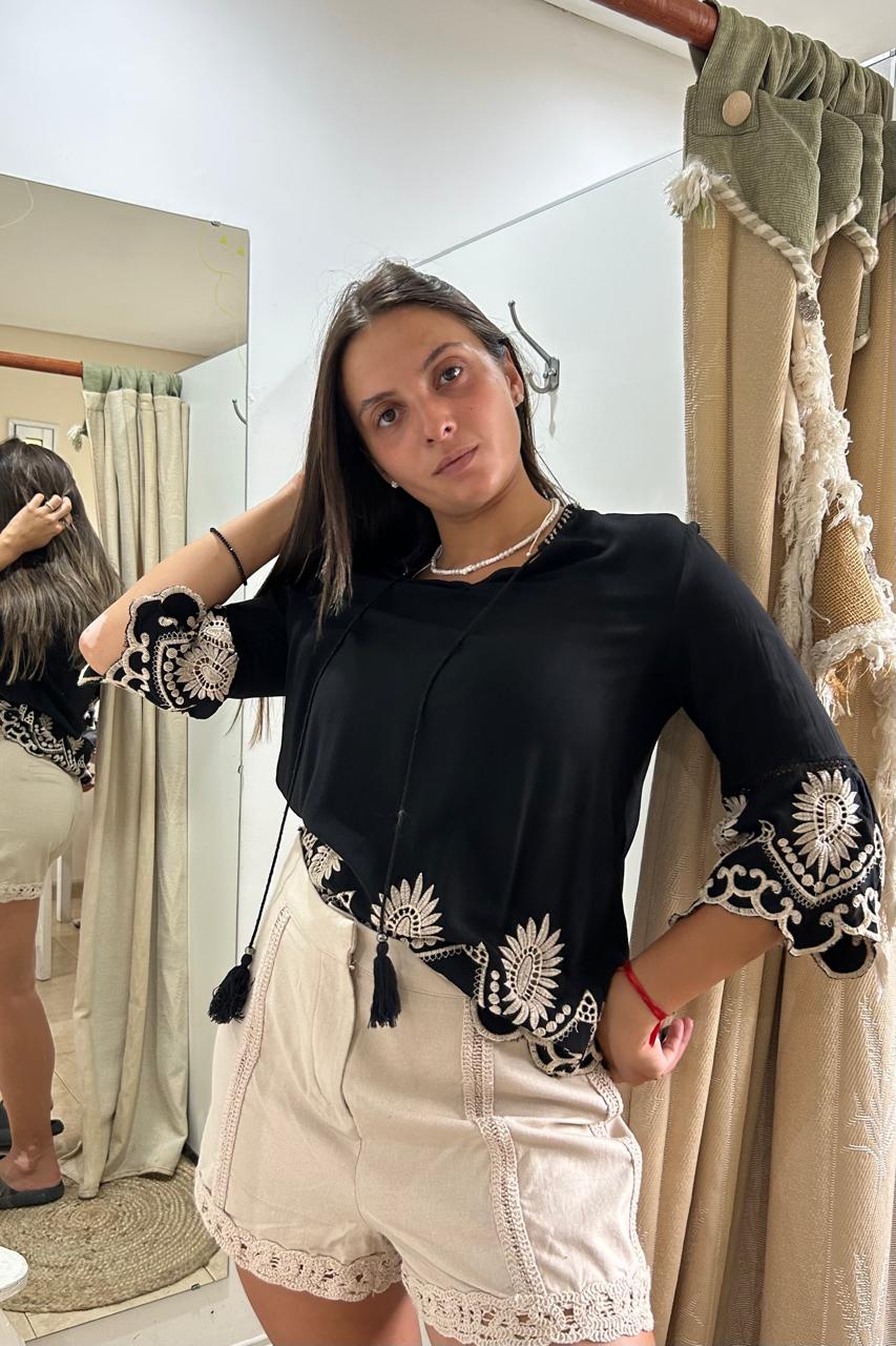 Contraste Nativo: Combinála con nuestro Short de lino con detalles de broderie (como en la foto) para un look luminoso y equilibrado.