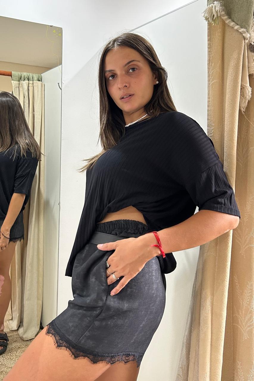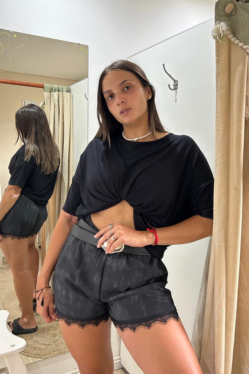 Look "Edgy" Romántico: Combiná el short con nuestra Blusa de Morley (como en la foto) para resaltar el contraste entre las texturas.