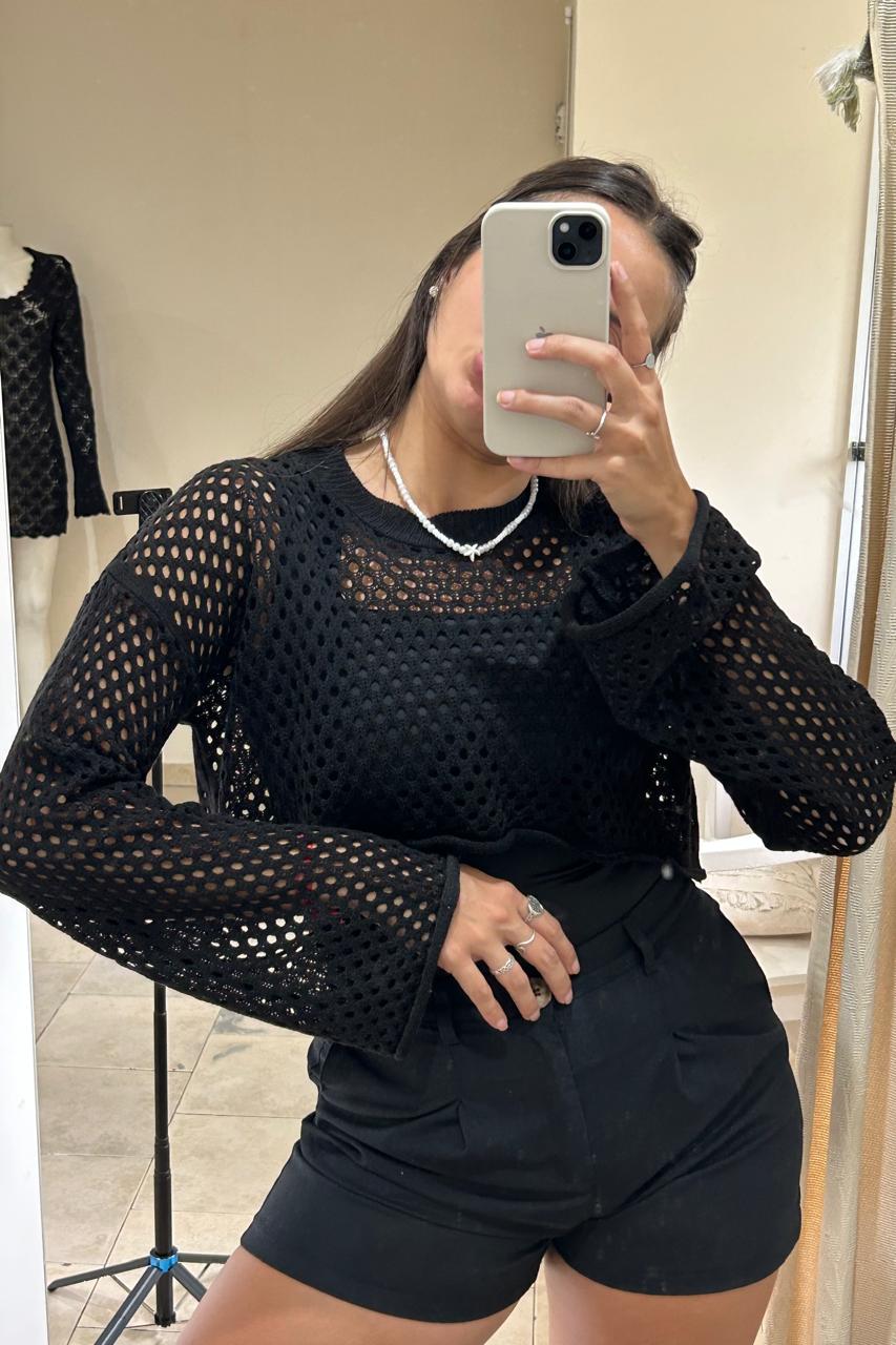 Noche de Verano: Combiná el sweater con un top básico negro debajo y nuestro Short de Lino (como en la foto) para un total black con texturas diferenciadas.