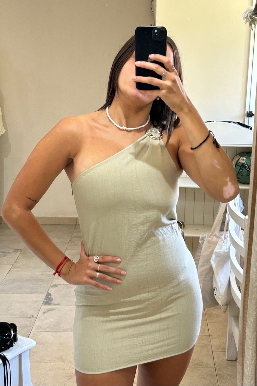 Vestido de una manga con agregado de avio plateado